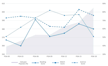 Tren nilai PISA Indonesia menunjukkan peningkatan sejak PISA 2000 hingga 2018, dengan peningkatan tipis pada bidang membaca dan sains, dan peningkatan lebih tajam di bidang matematika. Meski tren sepanjang periode naik, pada PISA 2018, skor Indonesia relatif turun di semua bidang. Penurunan paling tajam terjadi di bidang membaca.